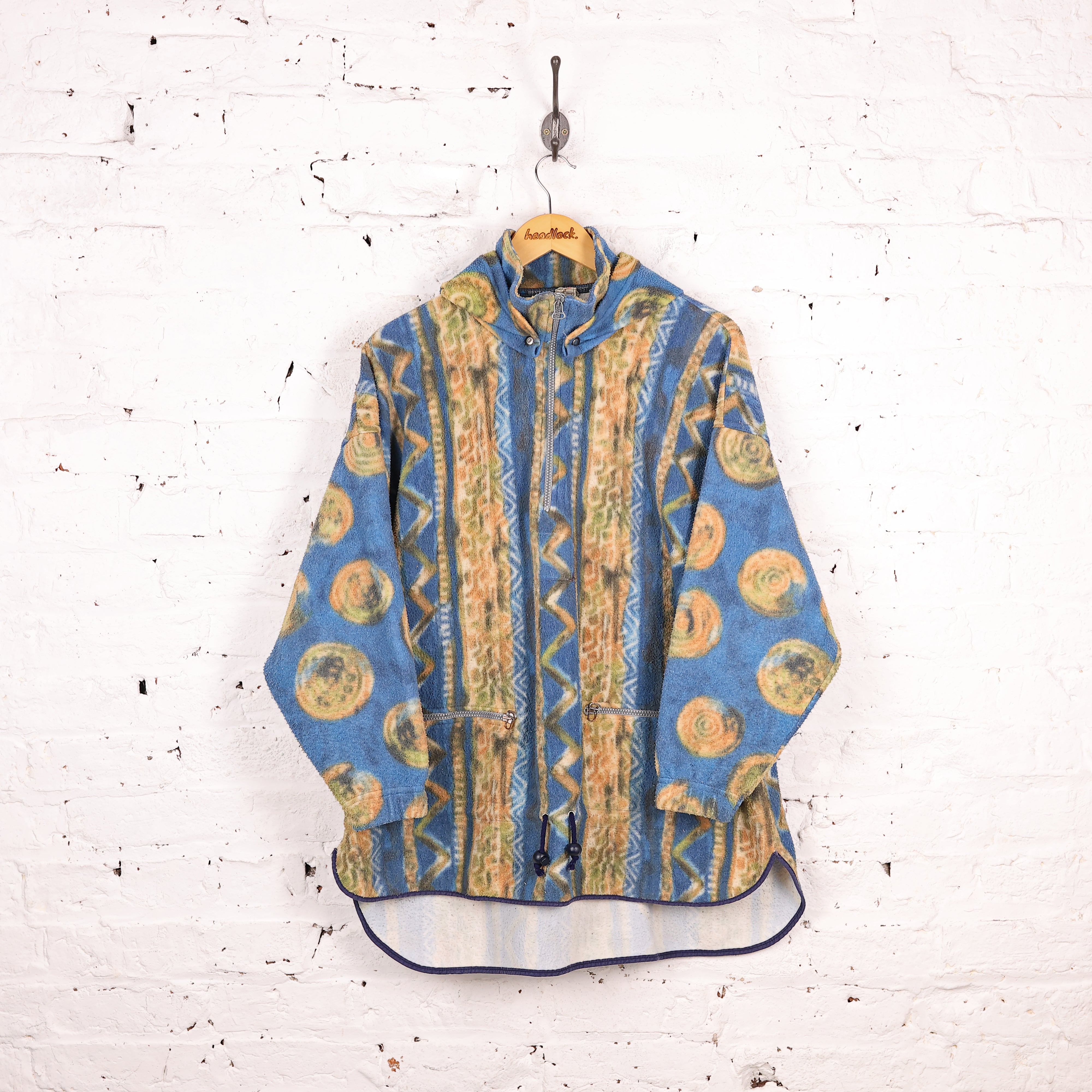 Good condition. Blue and green striped fleece with 1/4 zipper, two pockets and hood.
