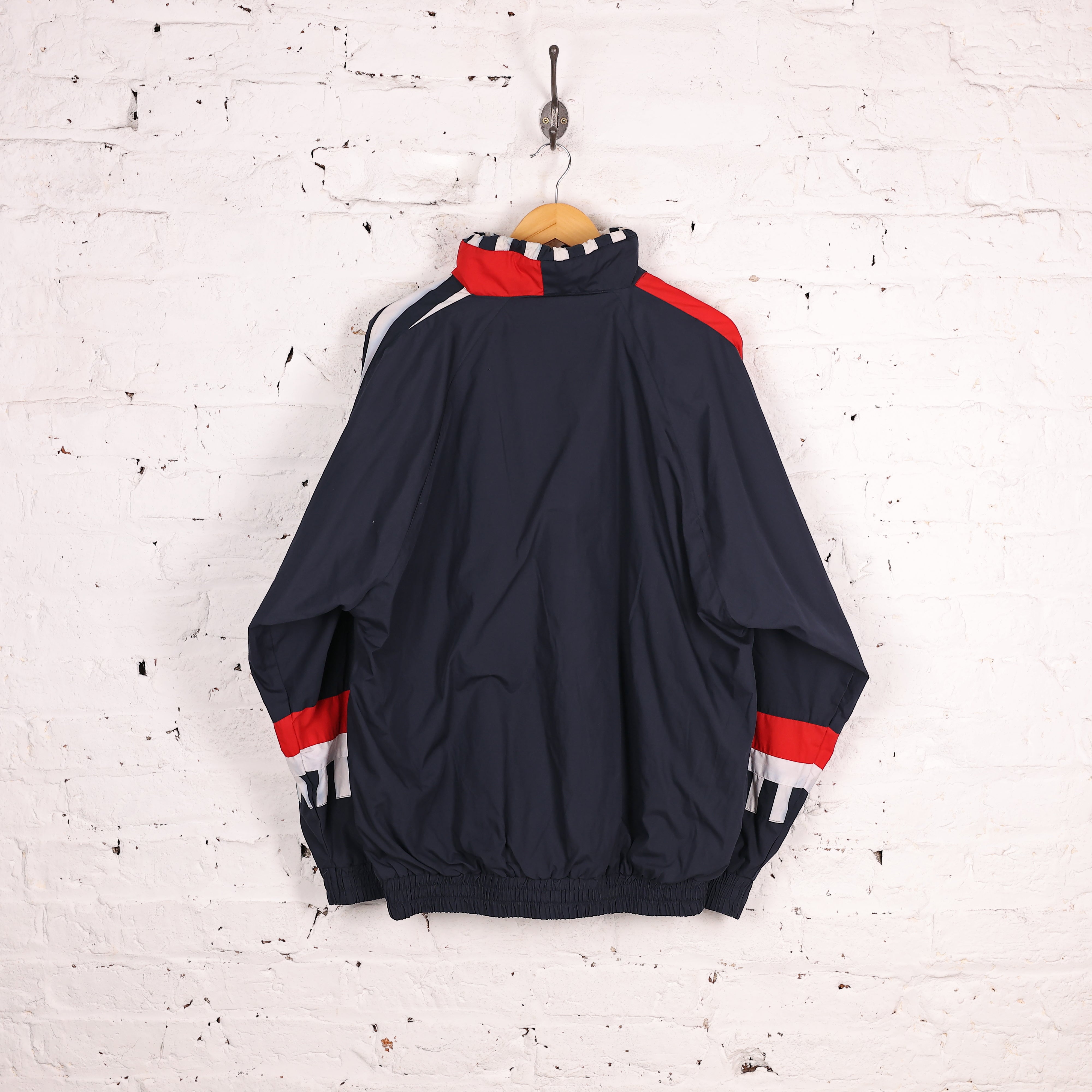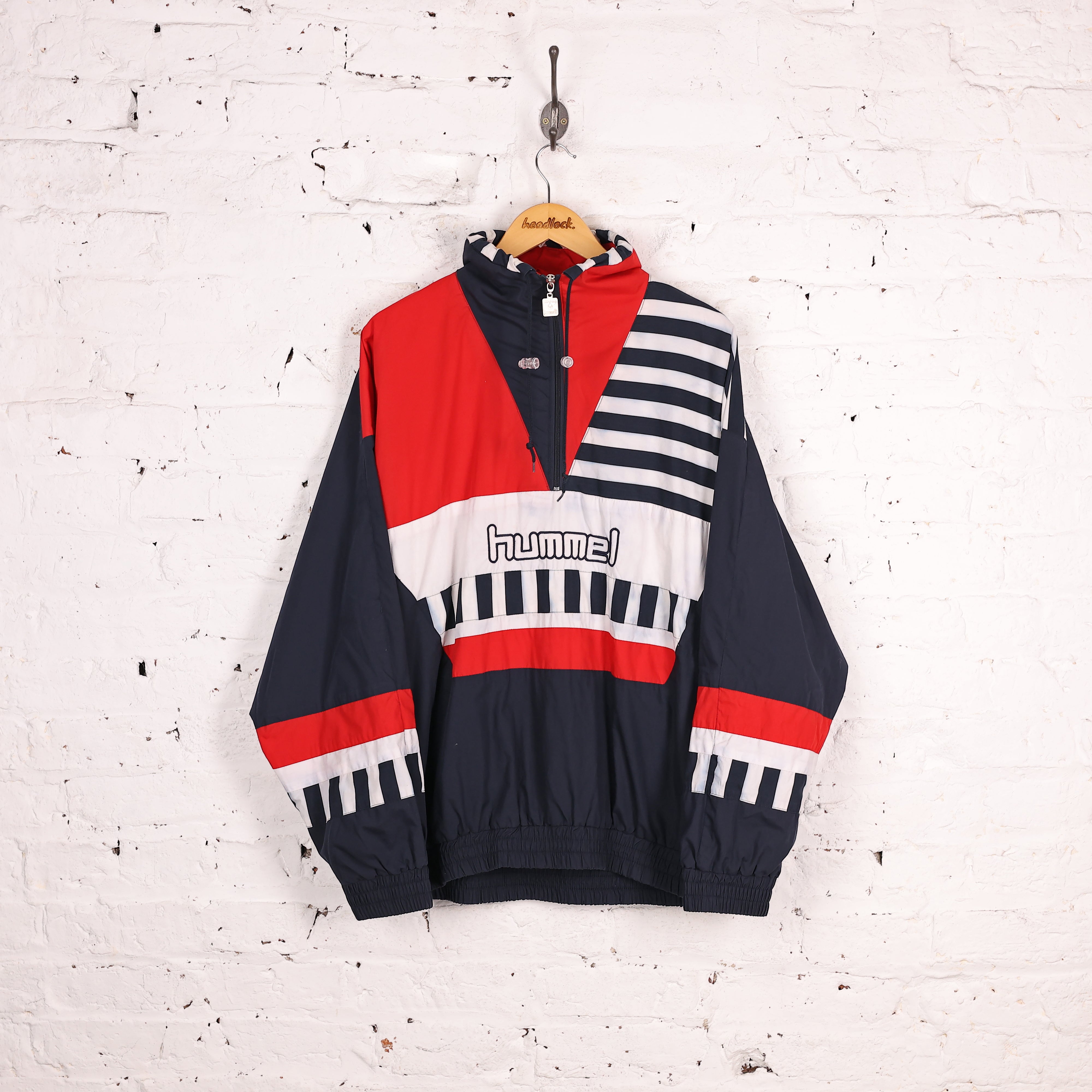 Good condition, some slight marks. Hummel tracksuit top in blue, red and white colours, stitched lettering across the chest and drawstring collar.