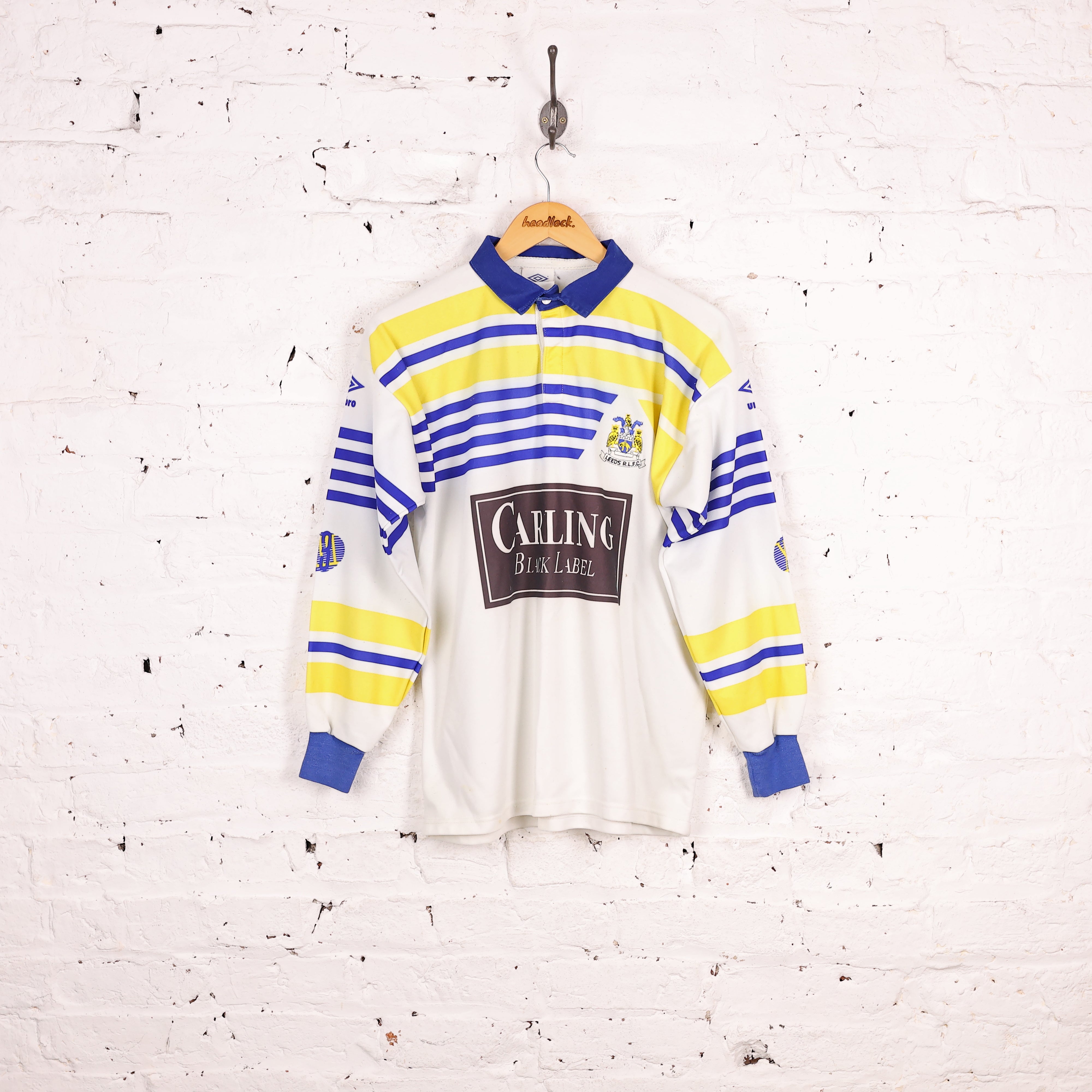 Good condition, some small spot marks. Leeds RLFC Shirt, pre the days of being the Rhinos, Leeds shirt with Carling Black Label sponsor made by Umbro in long sleeve. 1990-1991 season.