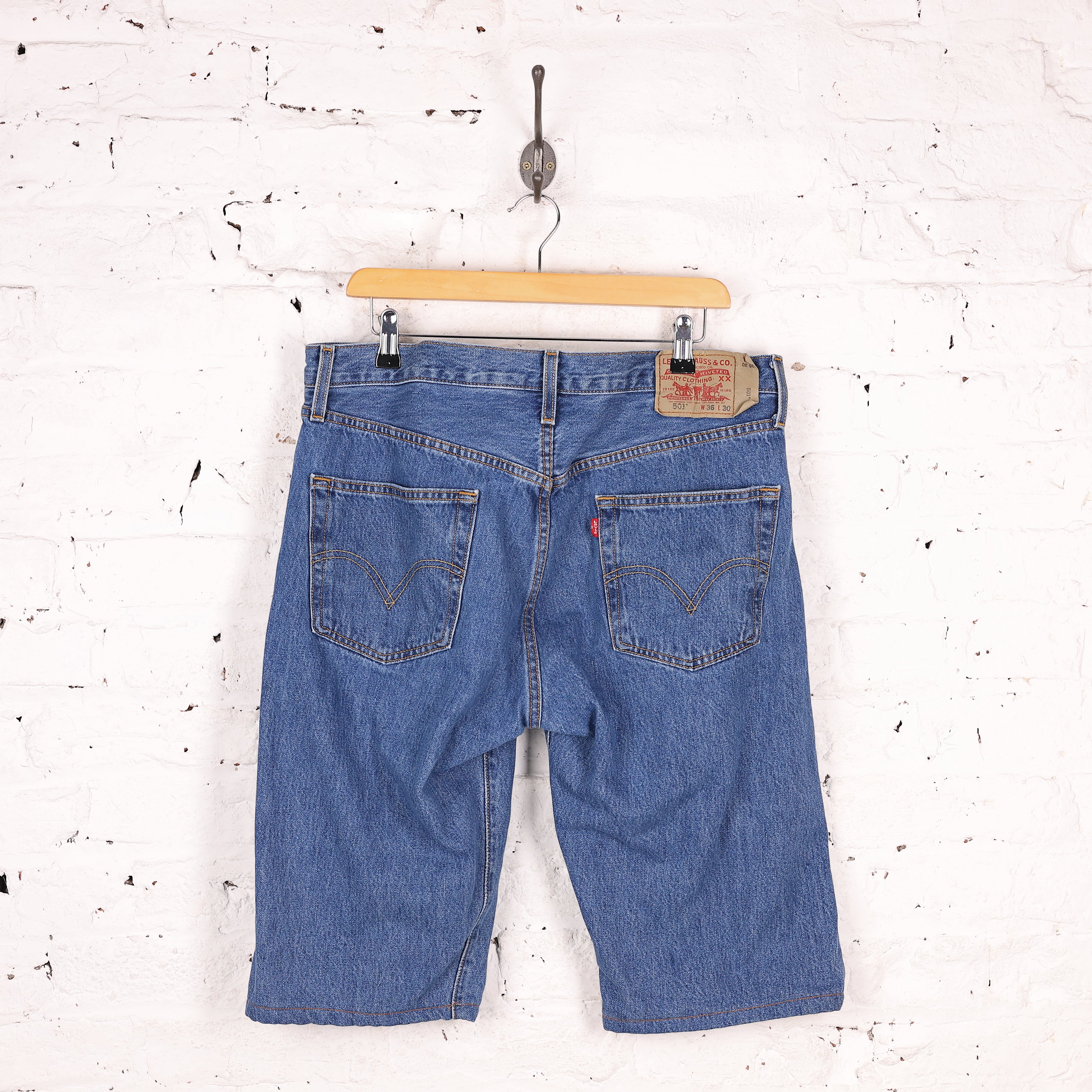 Good condition. Levi's denim shorts in mid blue with button flies classic tab on the back. Waist:36"
