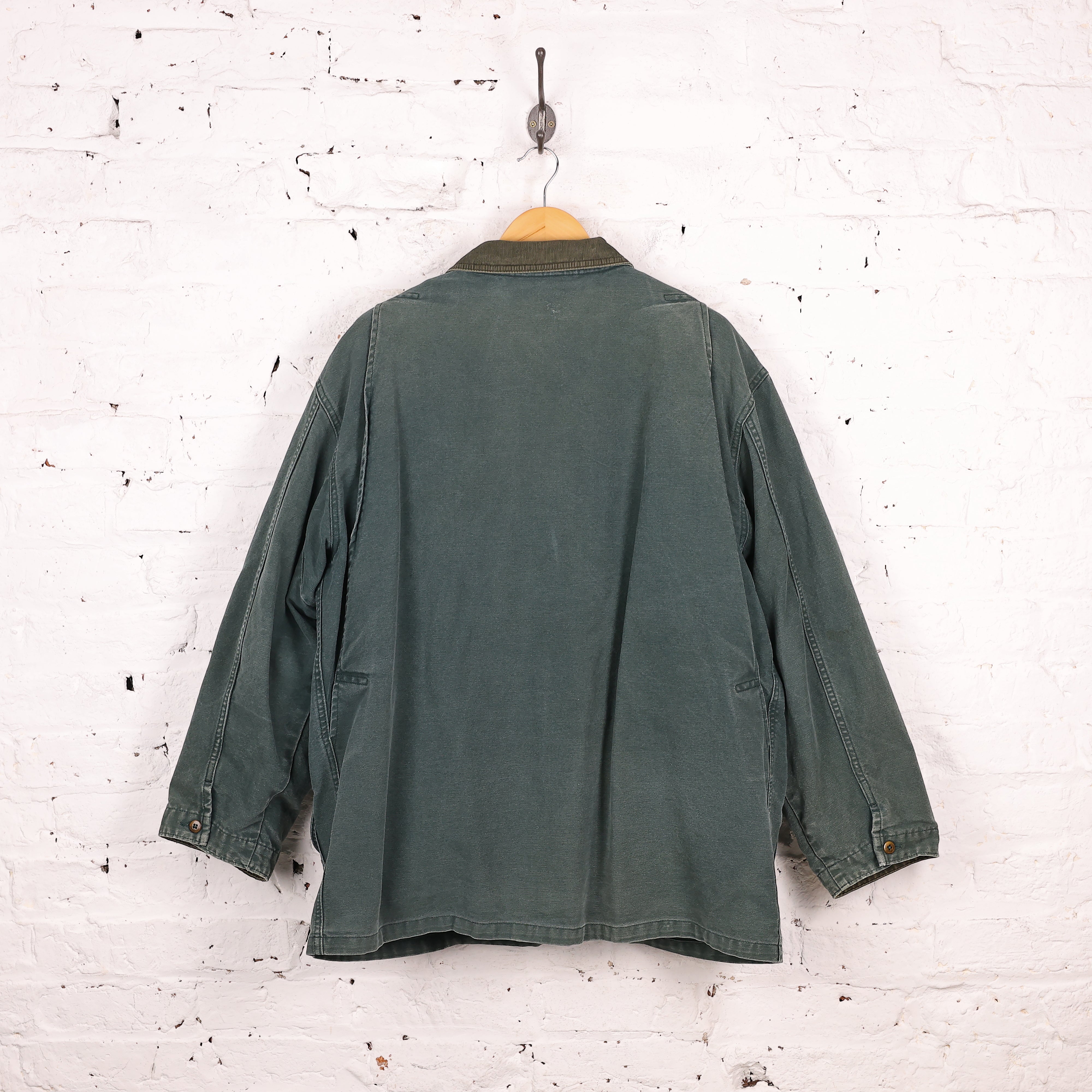 Good condition, some small spot marks. LL Bean barn jacket in green with contrast cord collar, double pockets and check fleece attachable inner lining.