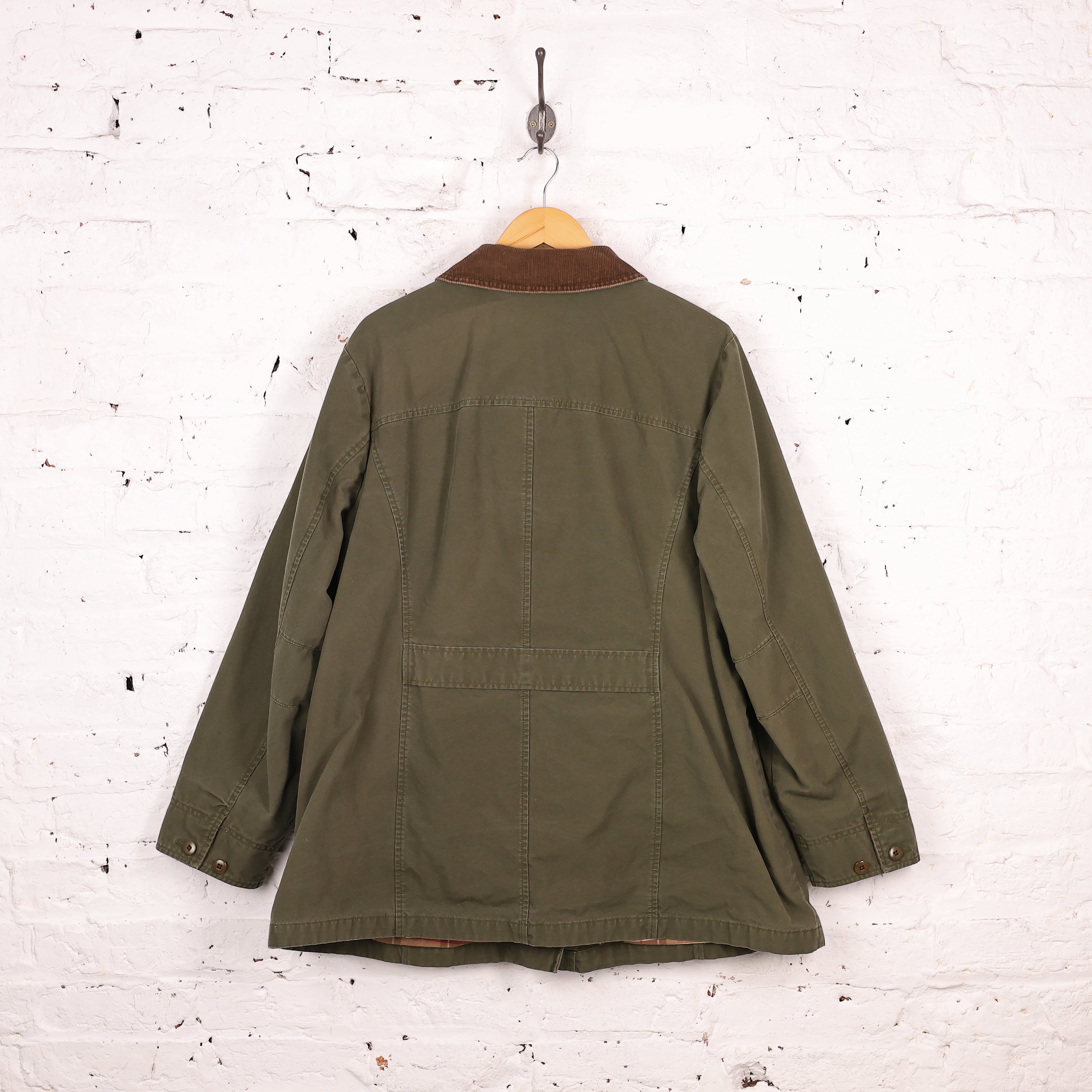 Excellent condition. LL Bean barn jacket in green with cord collar and four pockets, check inner lining.
