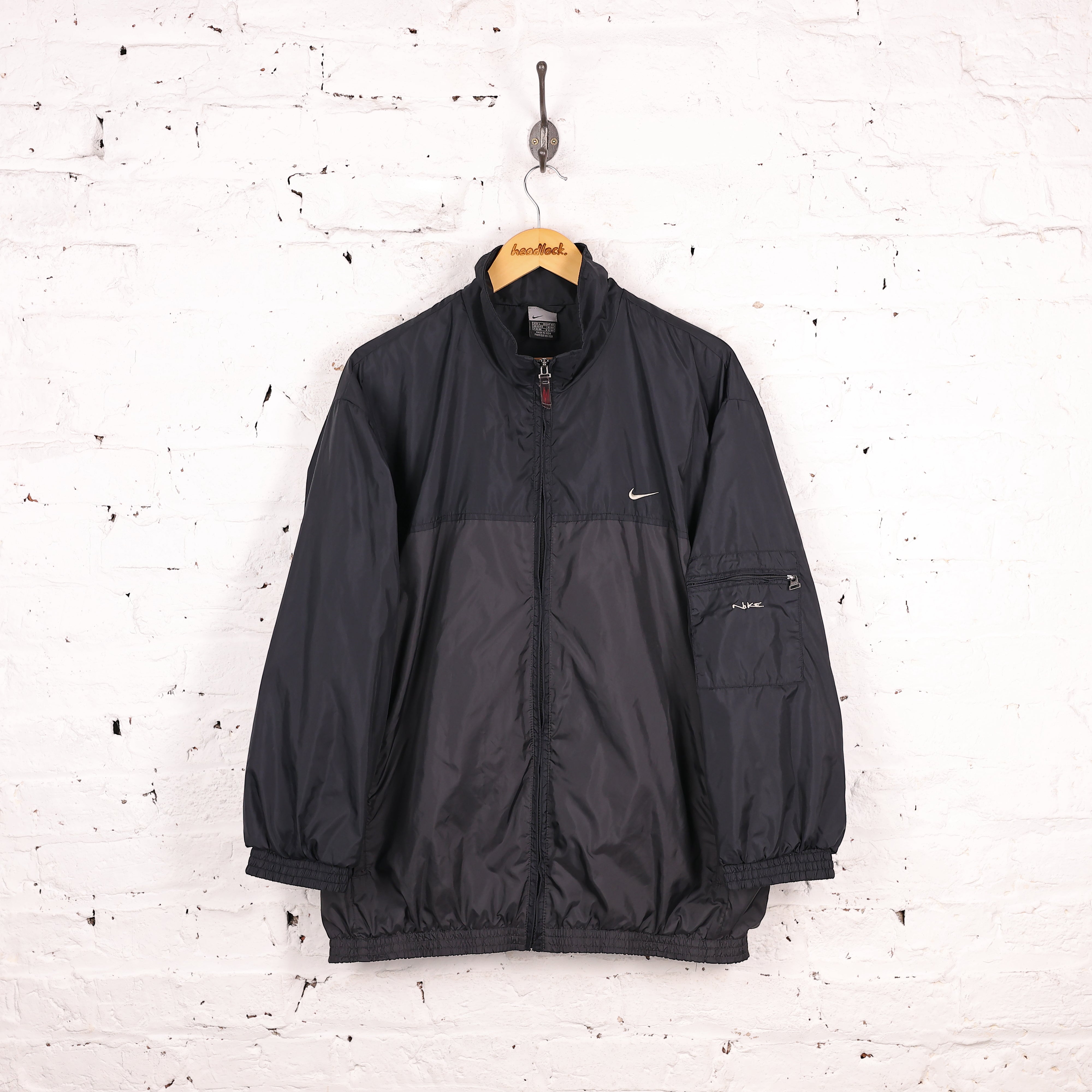 Good condition. Nike tracksuit top in black with stitched white logo, two pockets and stitched nike on the arm.