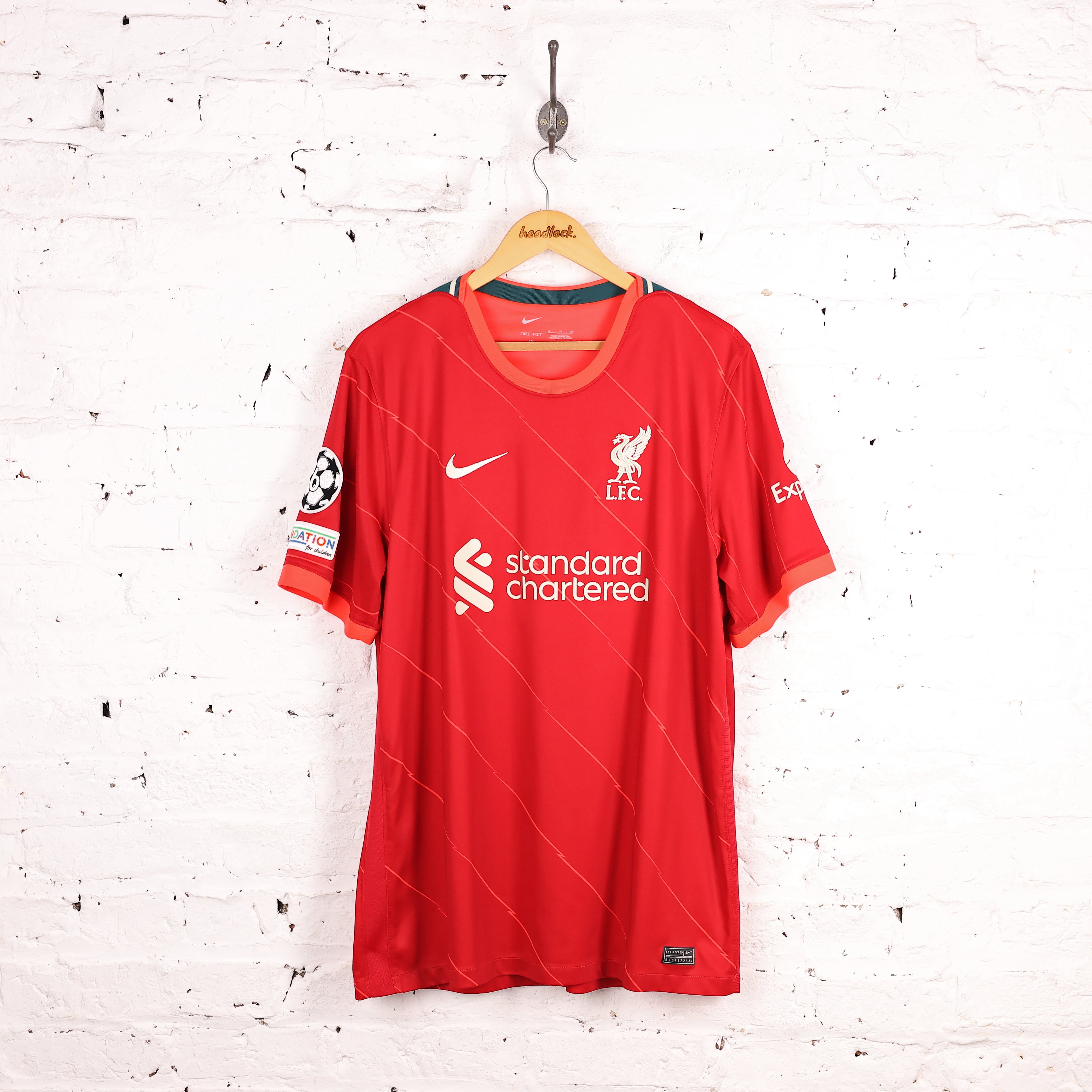 Good condition, champions league badge on sleeve largely peeled off. Liverpool FC home shirt from 21/22 Premier League season. Made by Nike with stitched badge and logo and 'standard chartered' sponsor.