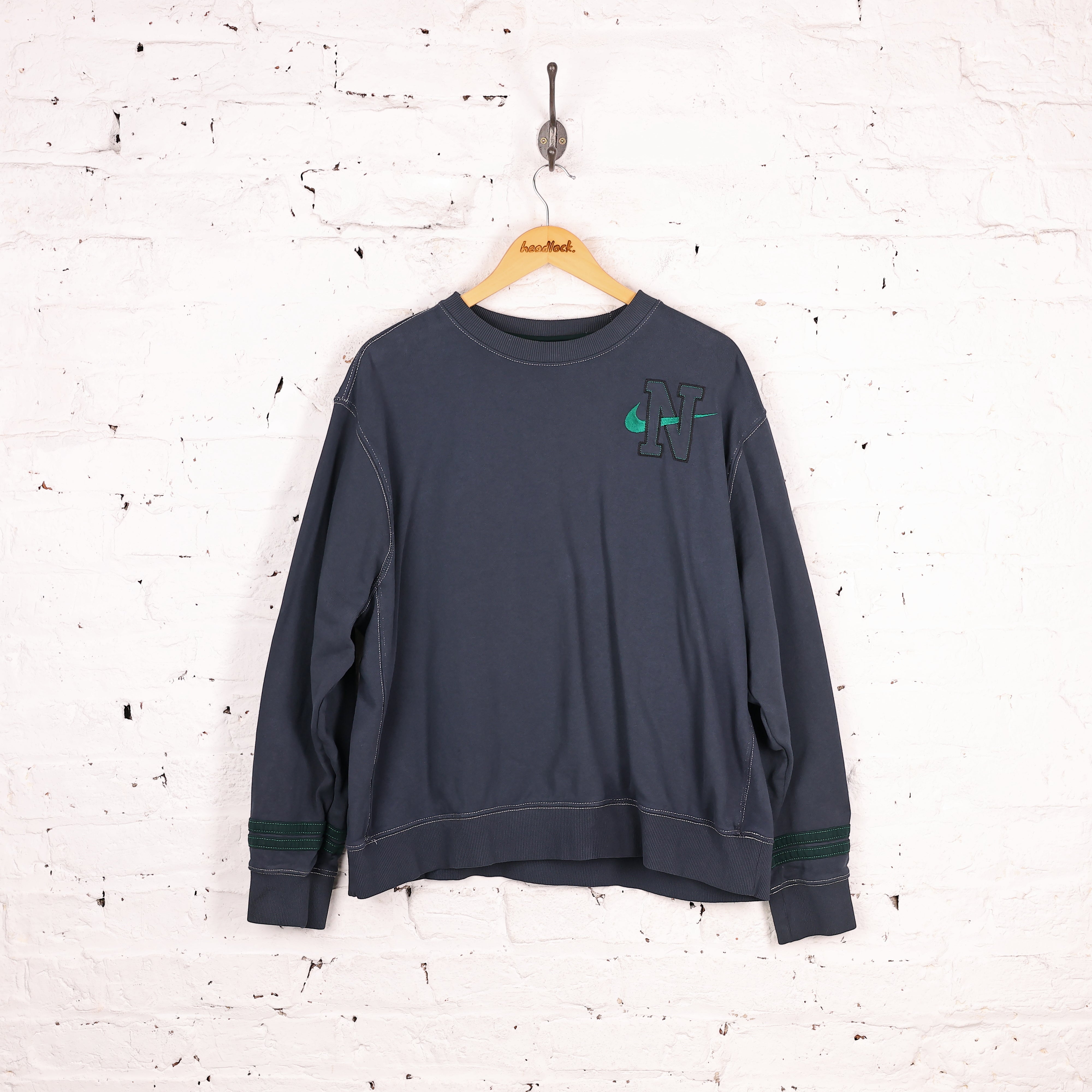 Good condition, slight wear. Nike sweatshirt in blue with stitched N and swoosh logo.