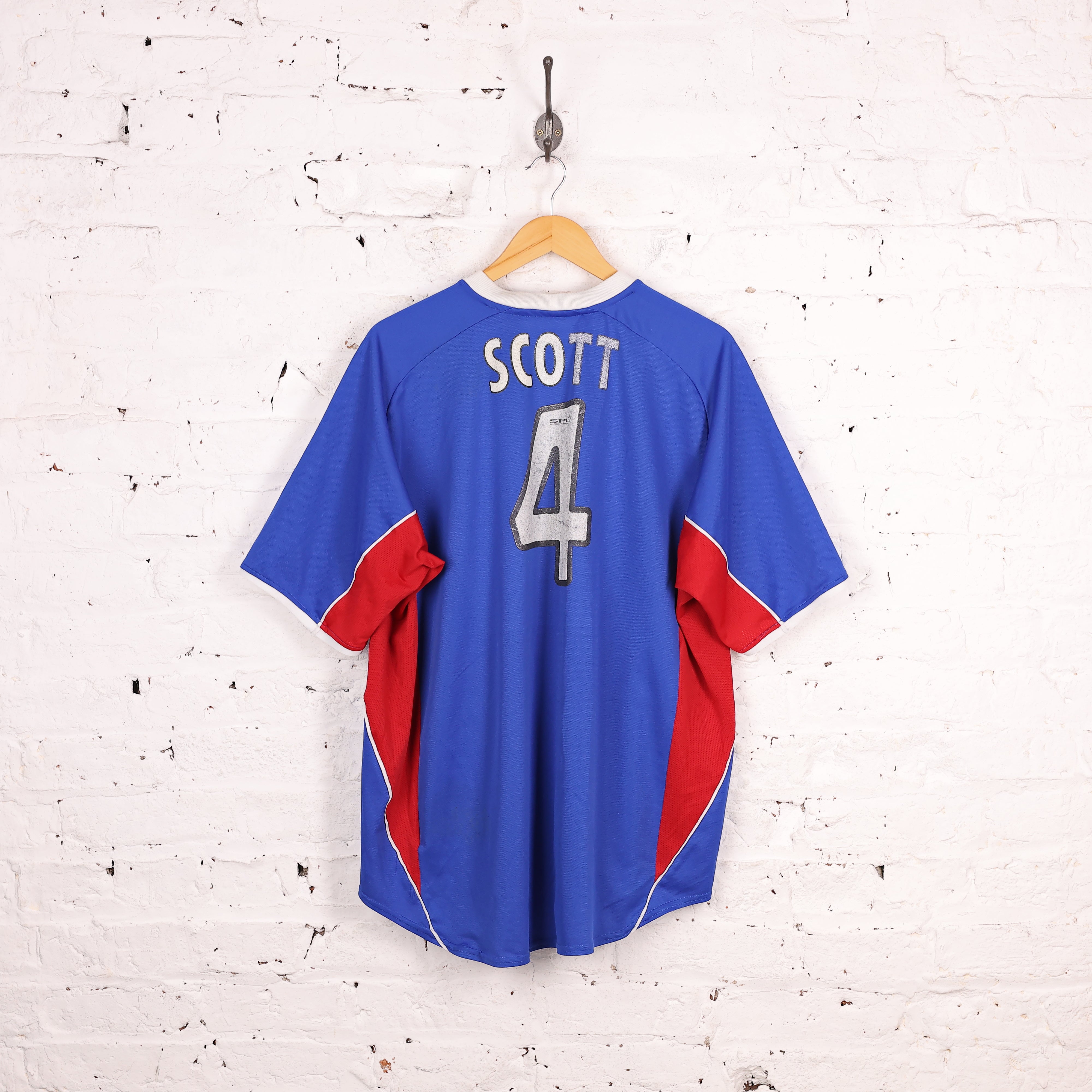 Good condition, small signs of general fading and wear. Rangers FC home shirt from 2001/02 Scottish Premiership season. Made by Nike with stitched badge and logo on the chest and 'ntl' sponsor. Scott no.4 on the back was unfortunately not a Ranger's player.