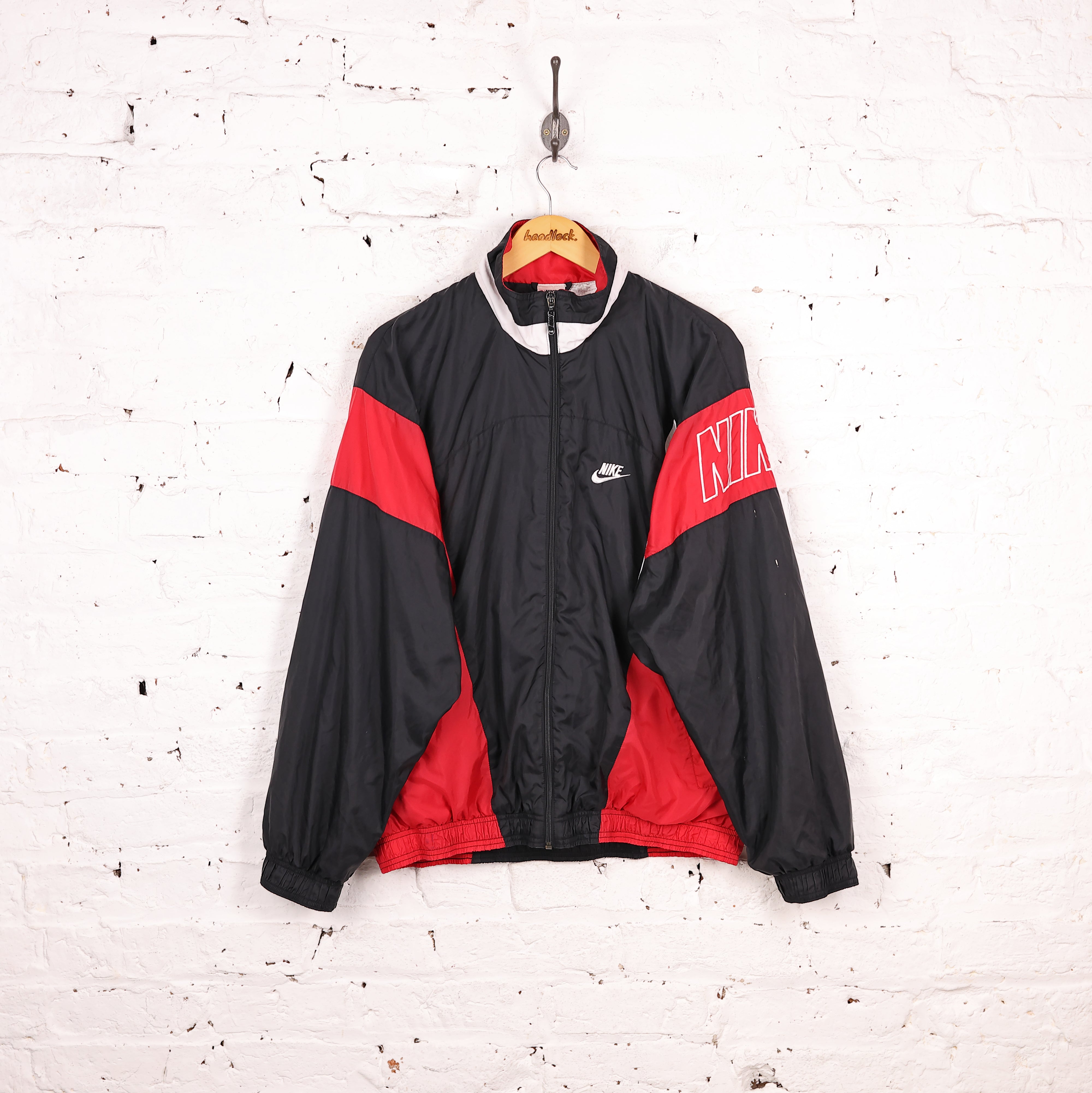 Good condition, small amount of paint on left sleeve. Nike shell tracksuit top jacket in black, red and white with stitched logo on the chest and two pockets.
