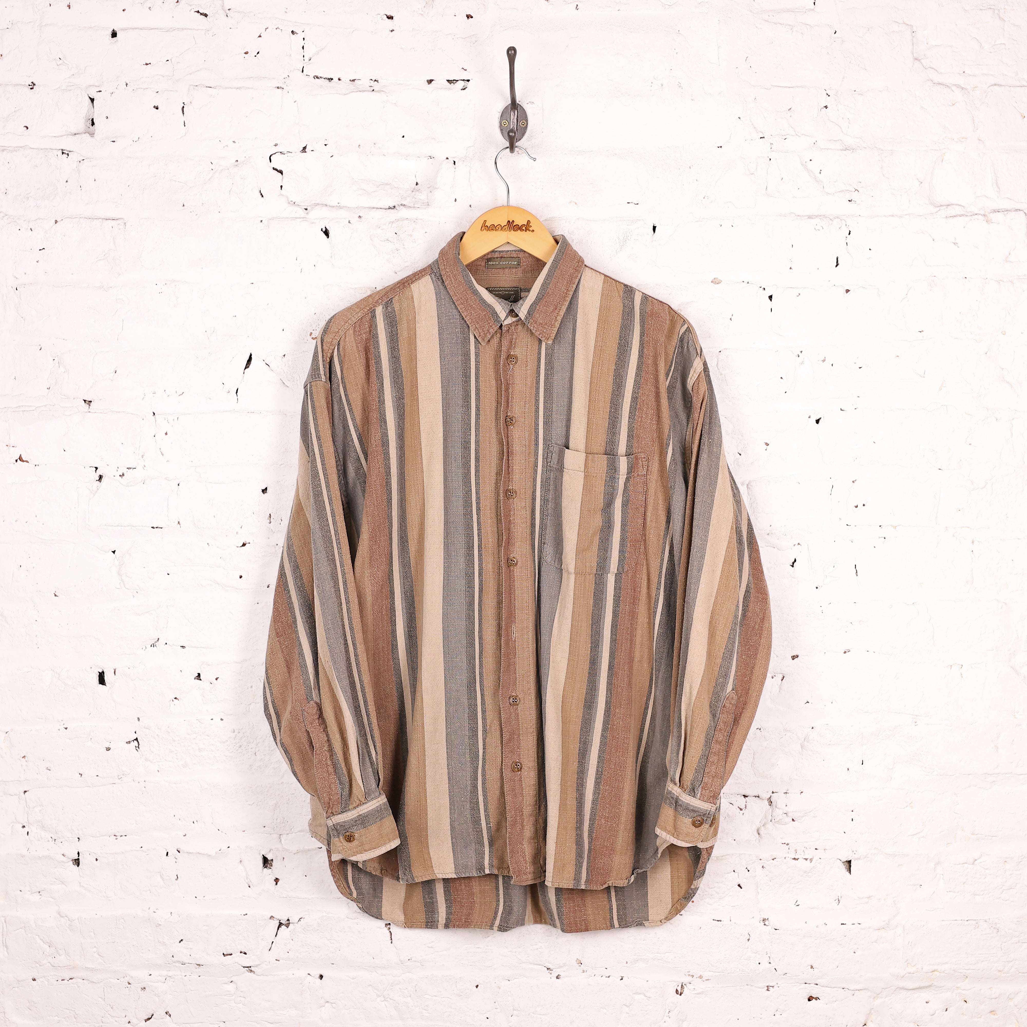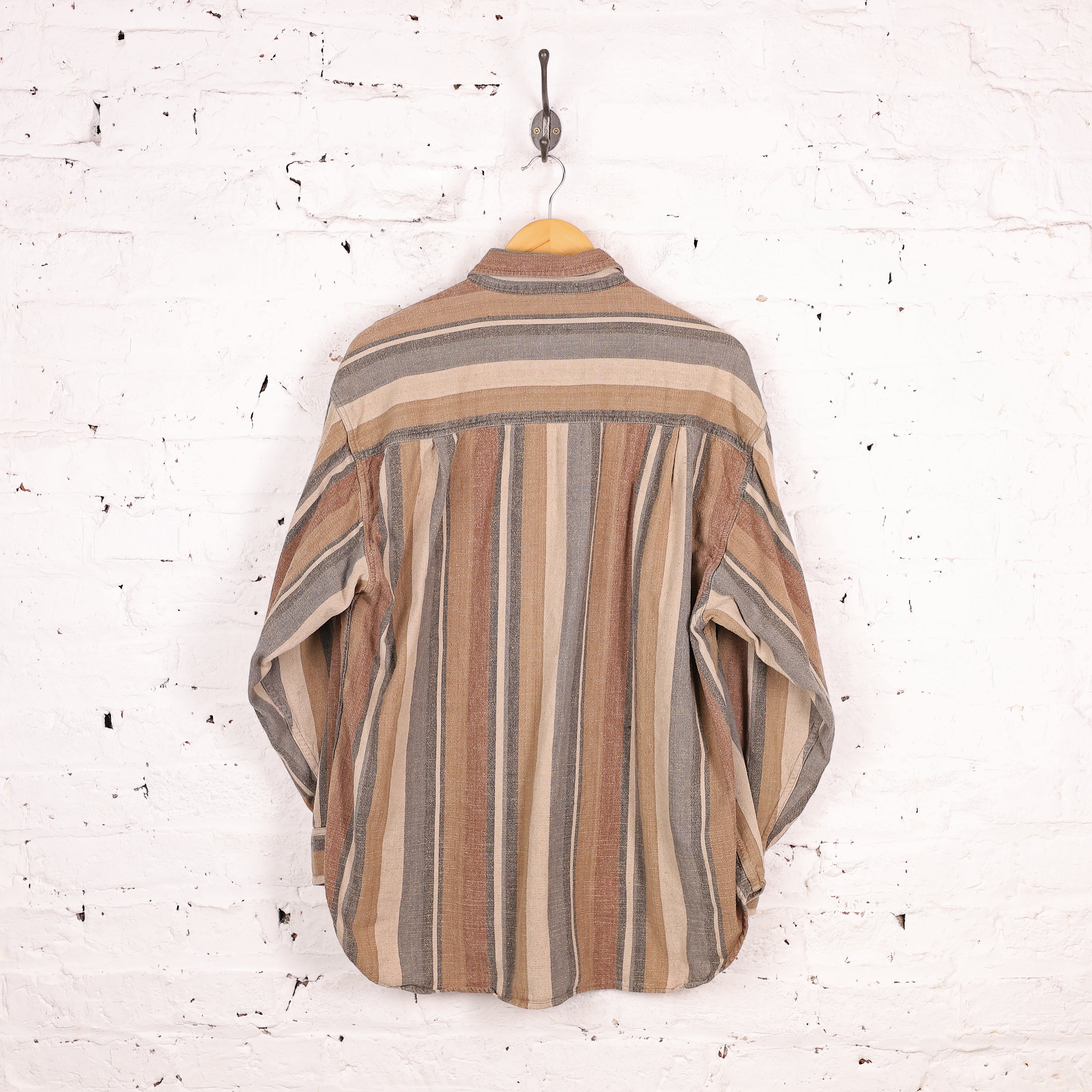 Good condition but missing third from bottom button. Brown striped flannel shirt with chest pocket in brown, beige and green stripe.