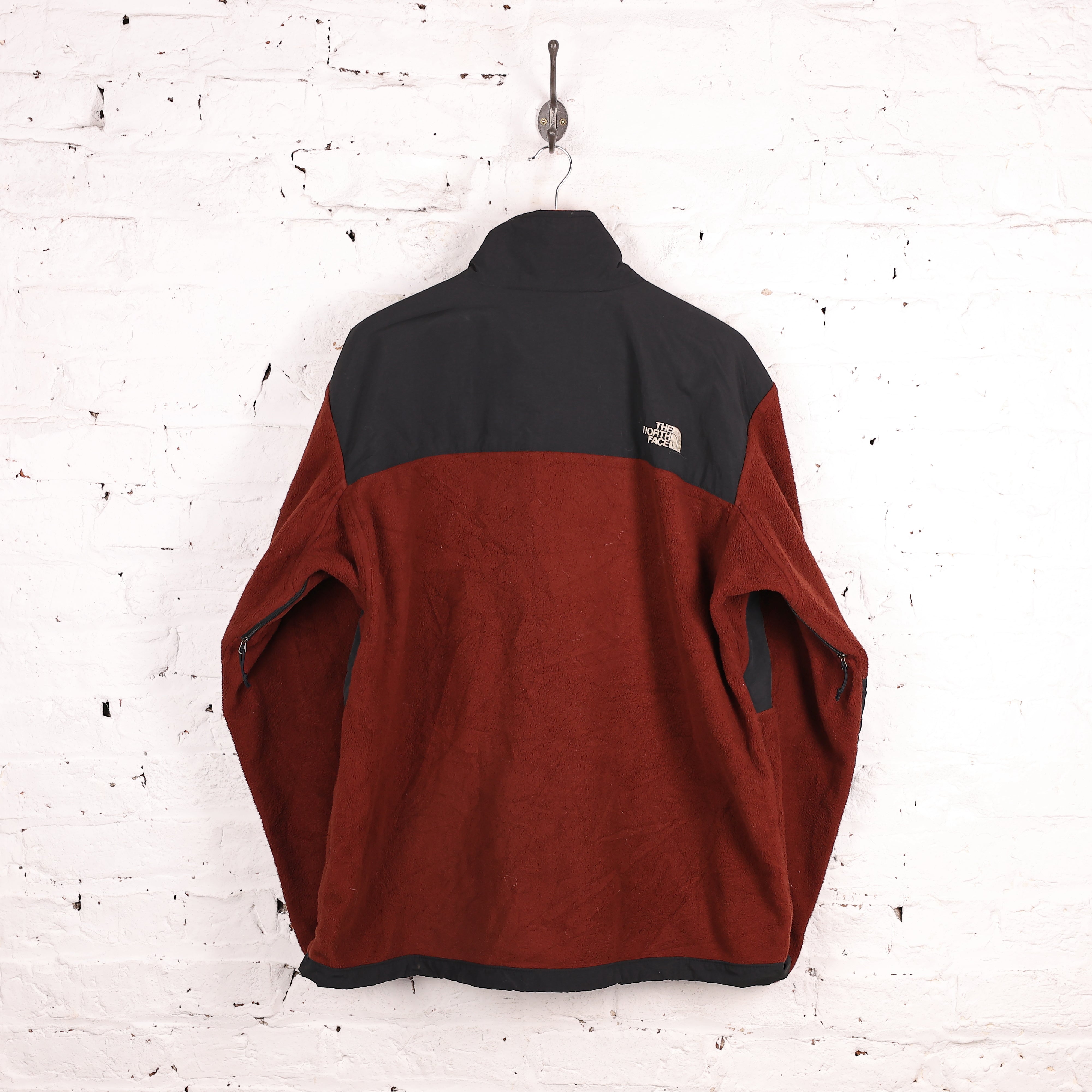 Good condition, small wear. The North Face Denali fleece in burnt red/maroon colour, black panels, stitched logo and zip pockets.
