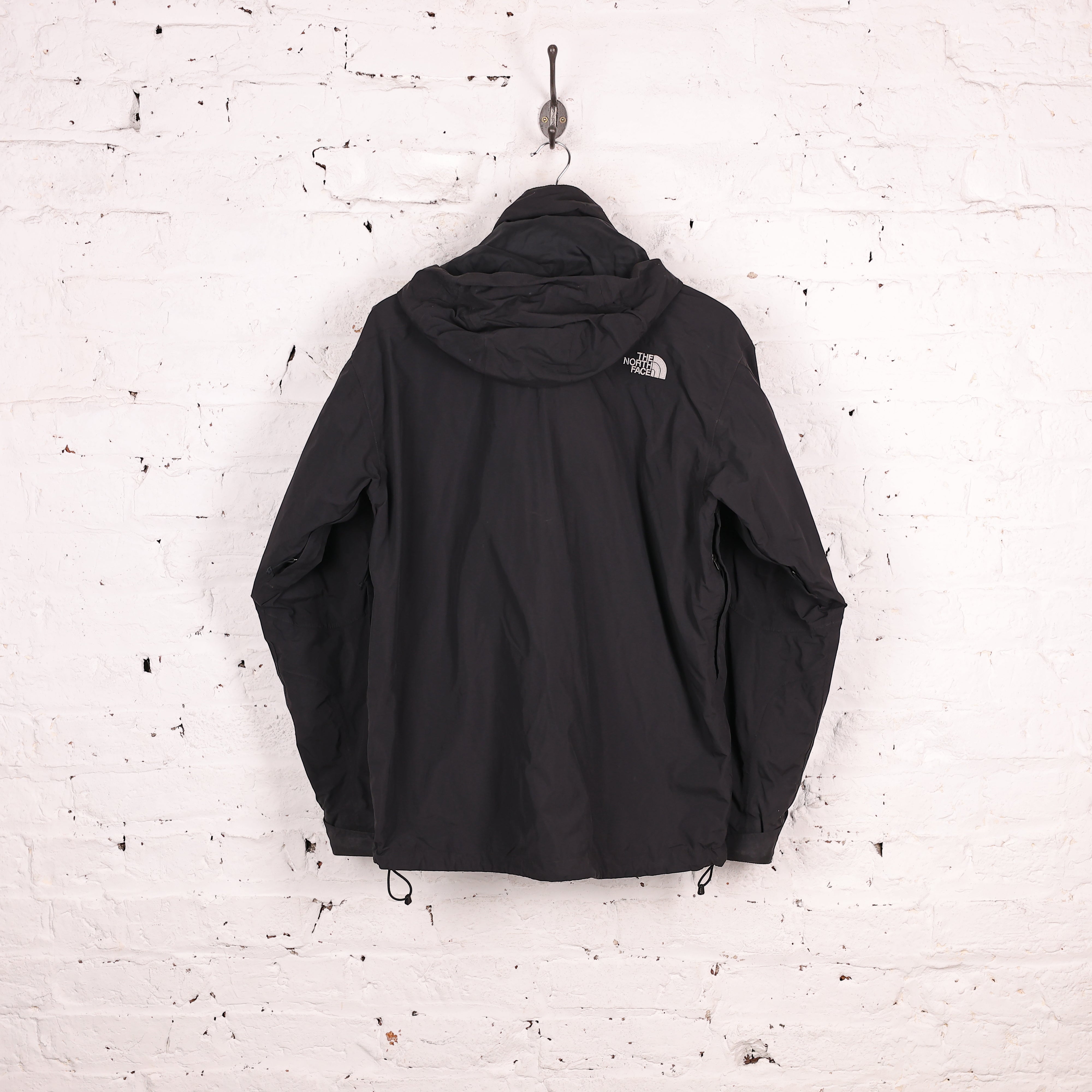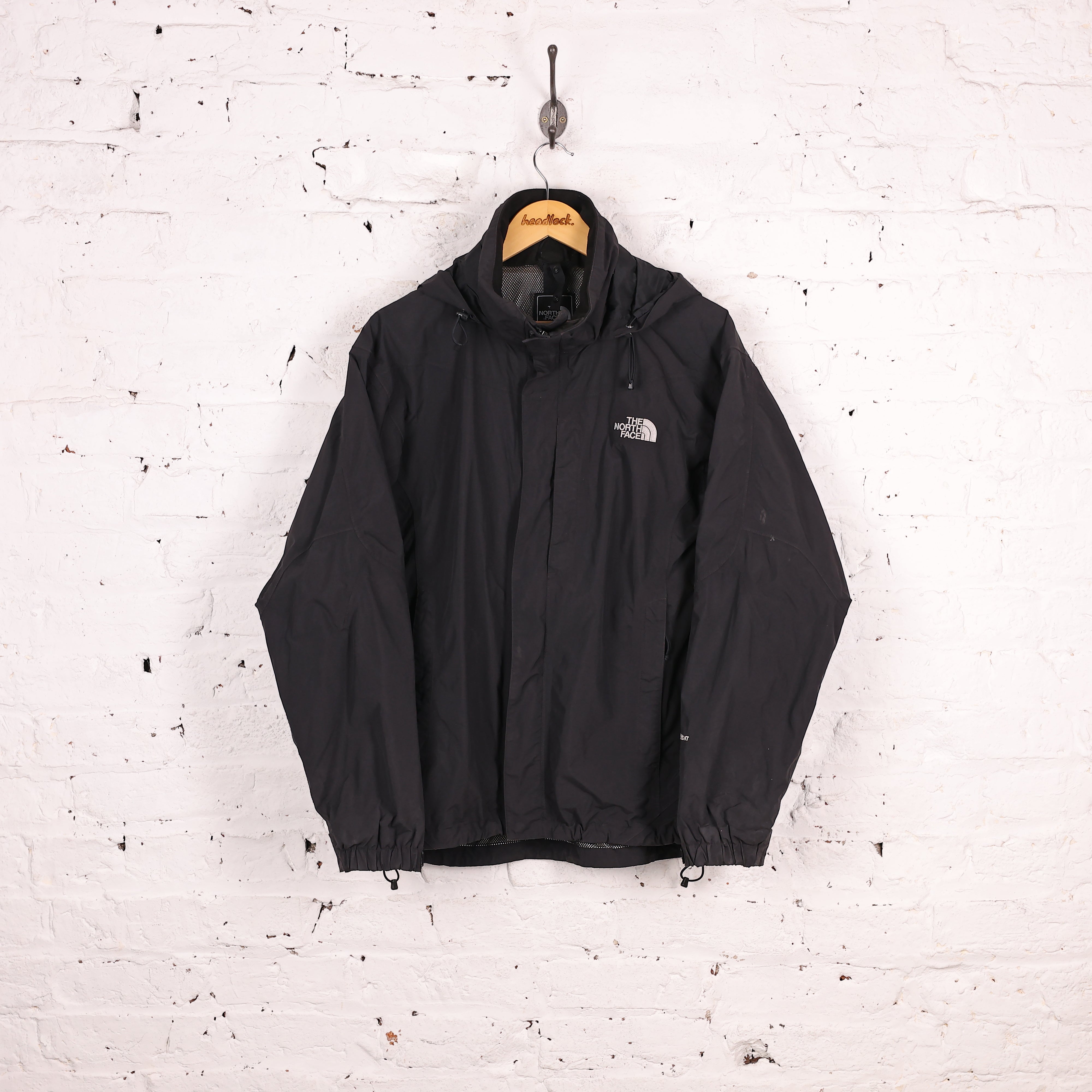Good condition. The North Face Hyvent rain jacket with zip pockets, stitched logo and hood in the collar.
