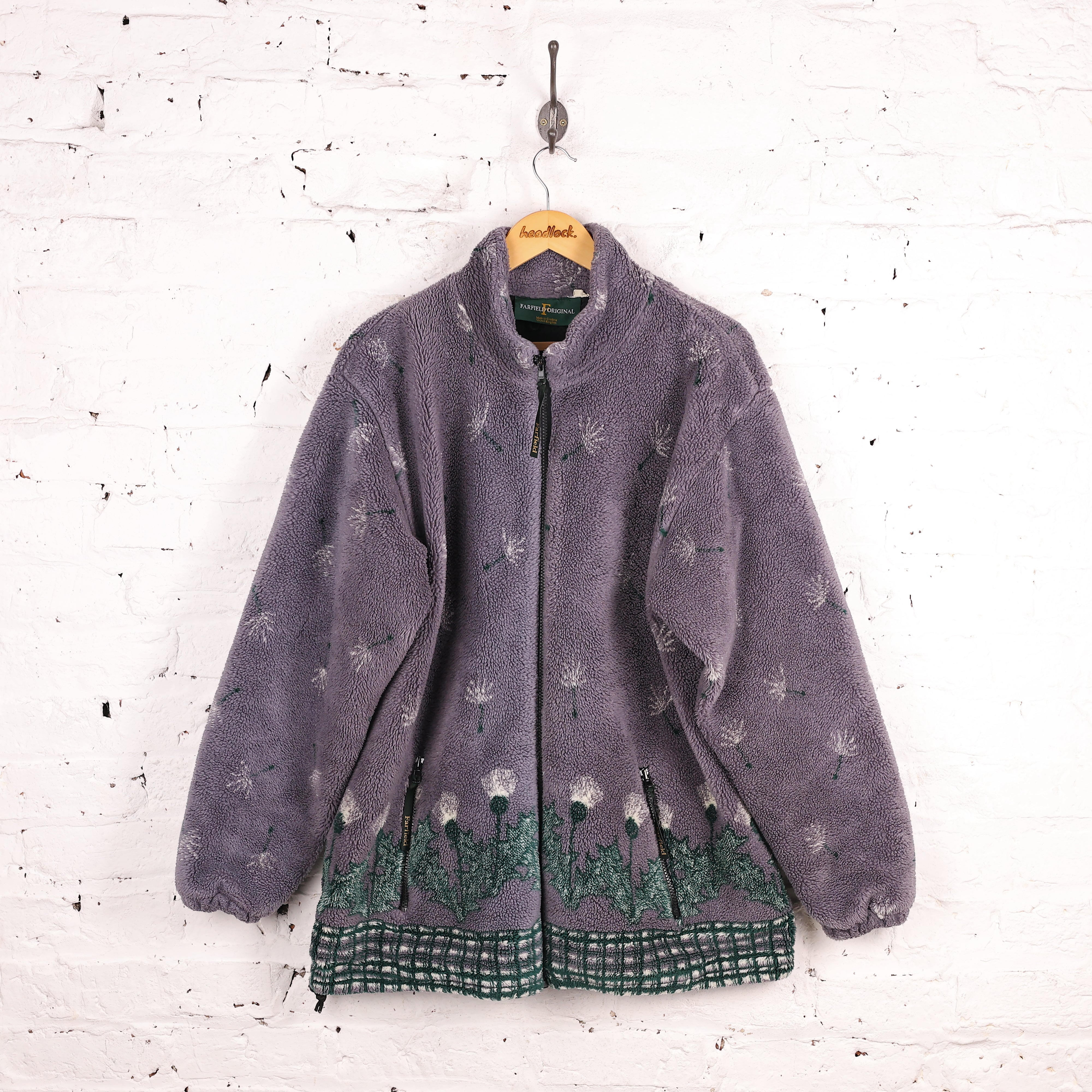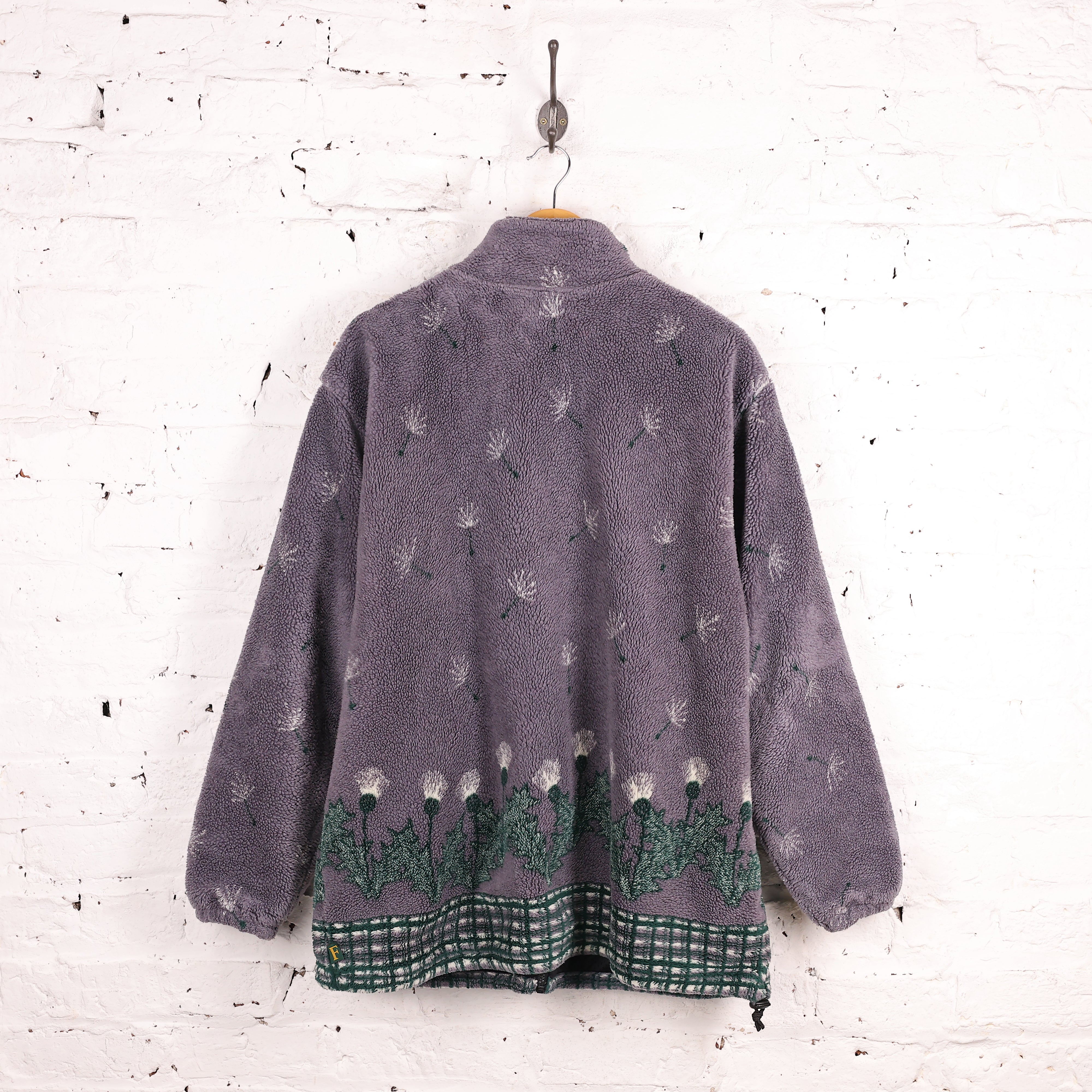 Good condition. Purple and green full zip fleece with thistles and seeds picture across the front and back.