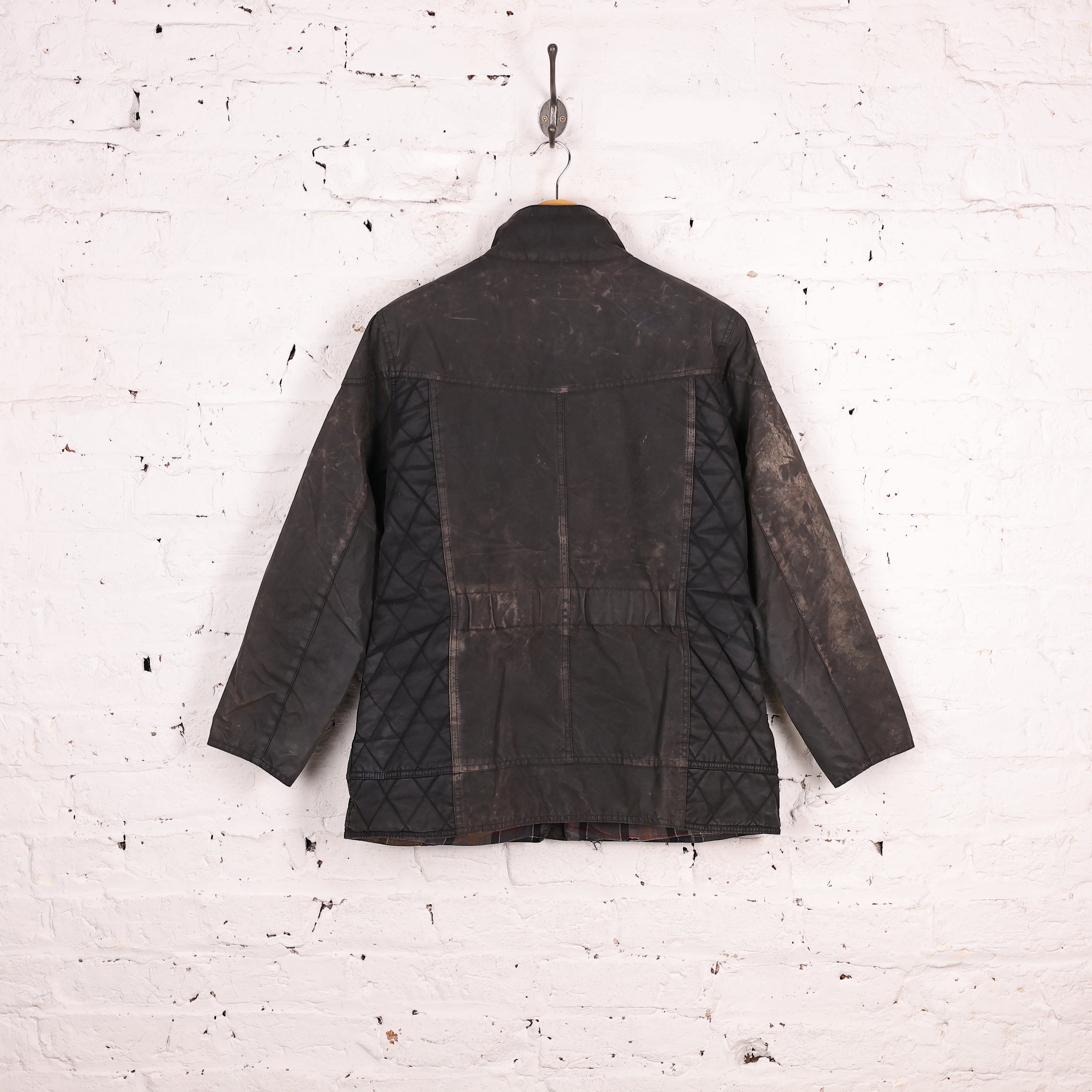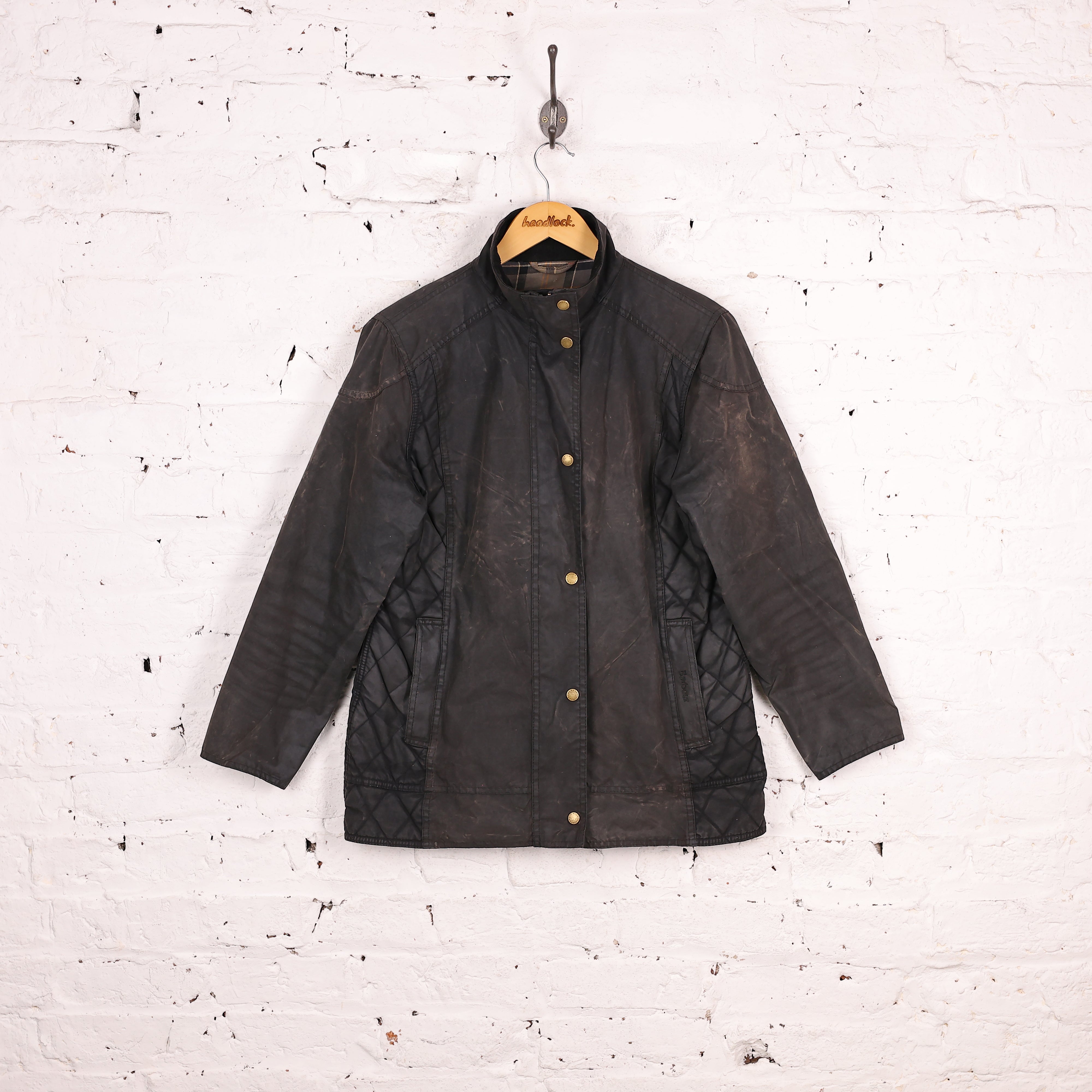 Good condition, slight wear to the outer. Barbour Conine wax jacket with cord collar, check inner lining and quilted wax on the sides. UK 14