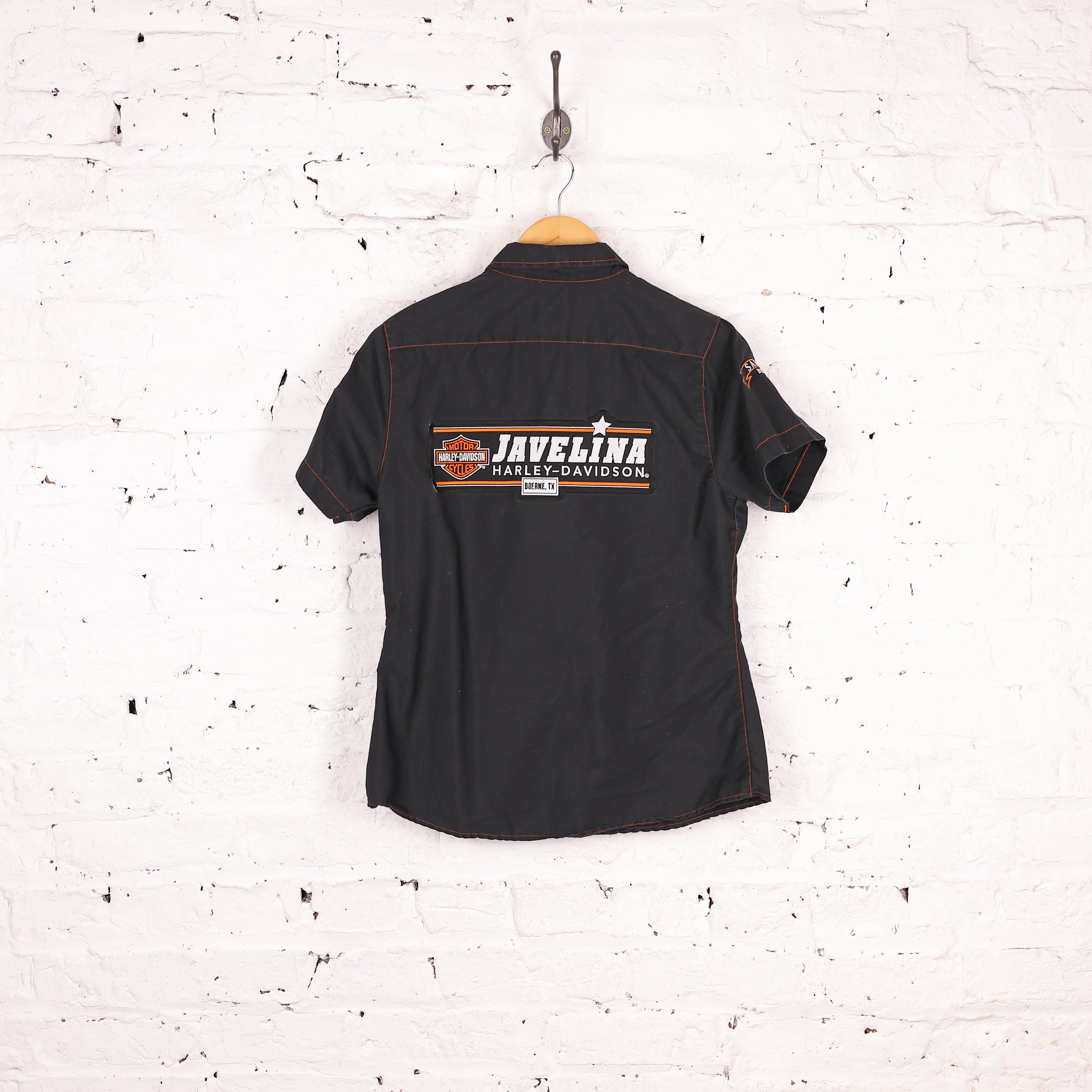 Good condition. Women's Harley Davidson shirt in black with stitched badges and contrast orange stitching.