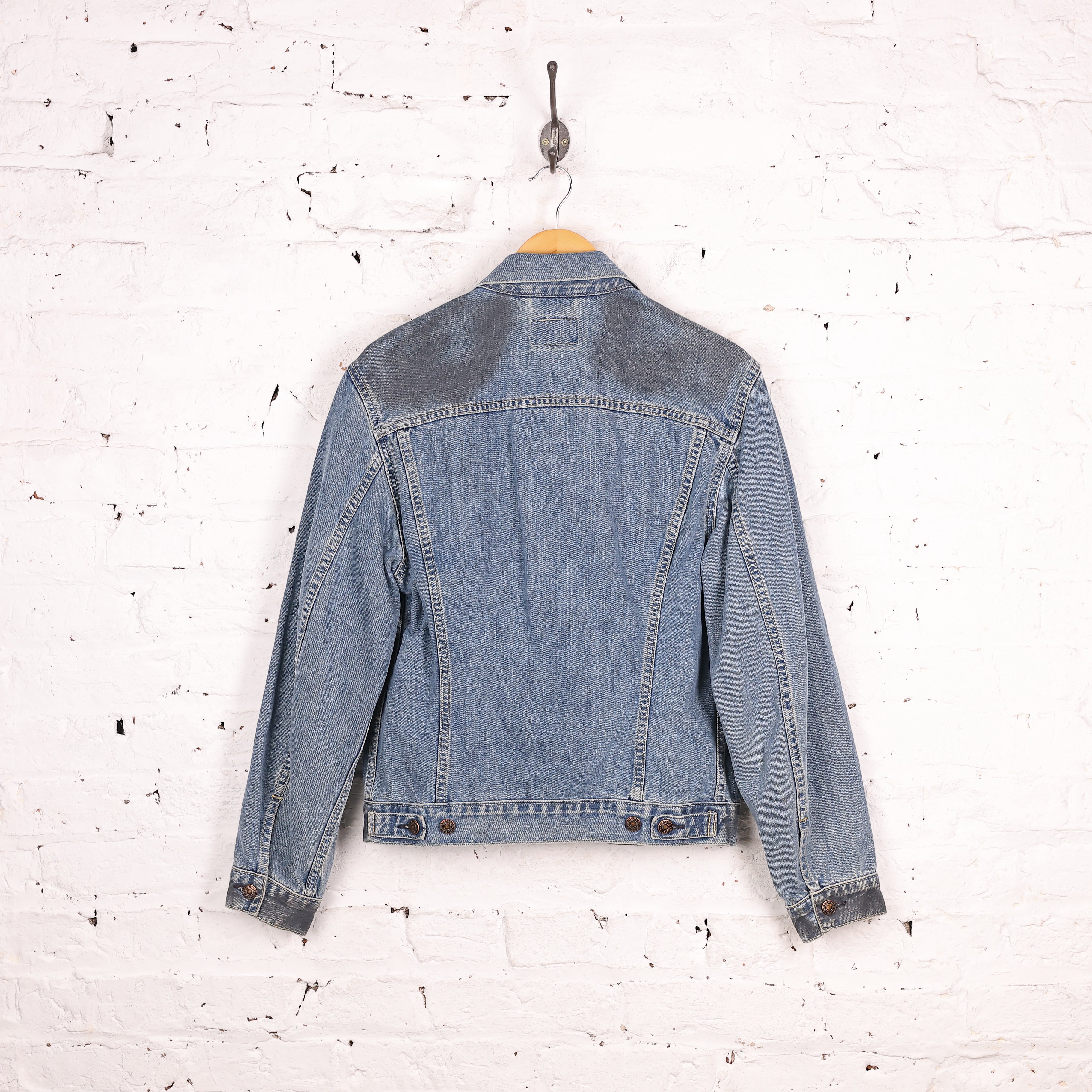 Good condition with black/darker wear patches on chest and cuffs. Levi's denim jacket in mid blue denim, bronze buttoning and two chest pockets.