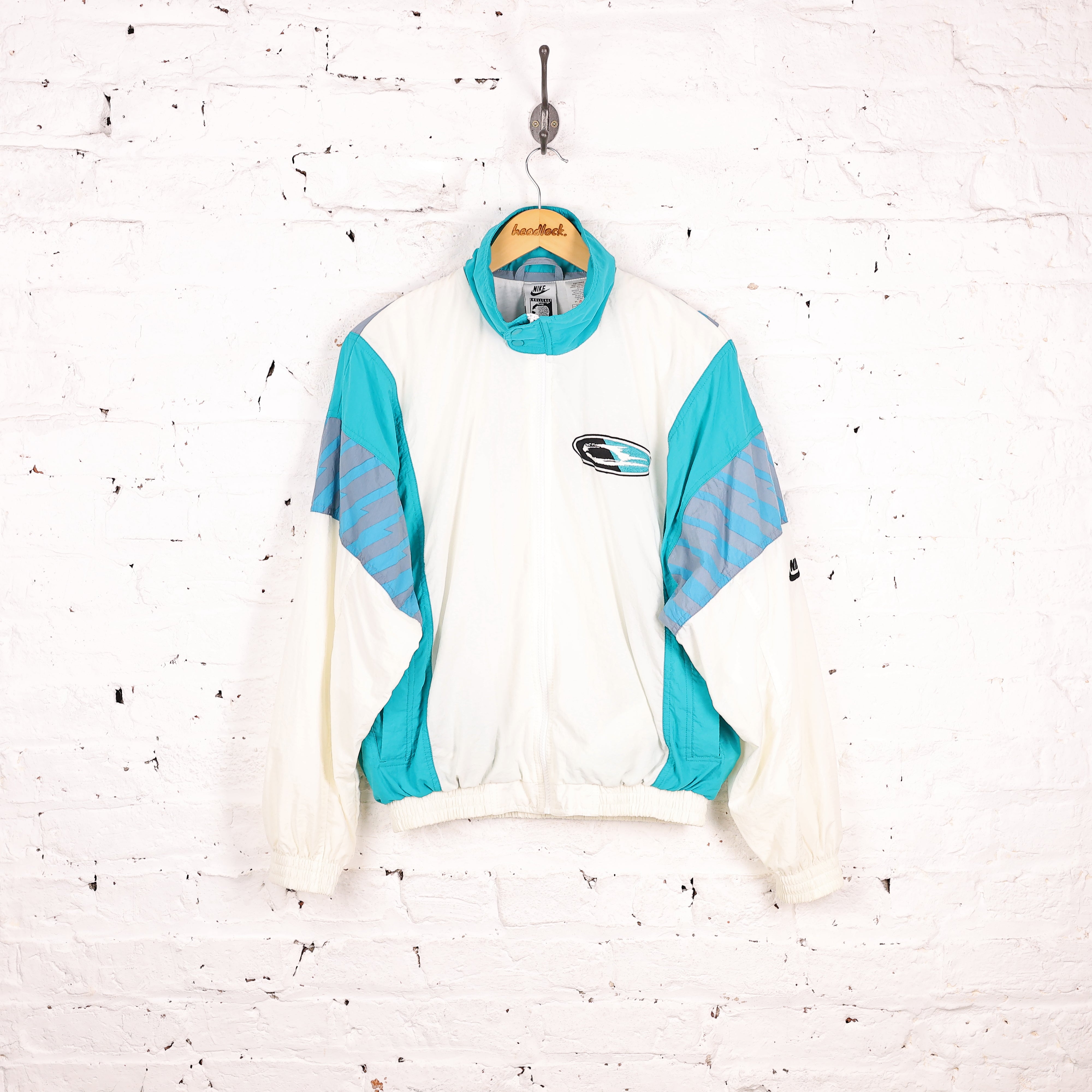 Good condition. Women's white and green Nike shell jacket with stitched Challenge Court logo on the front, two pockets and zip fastening.