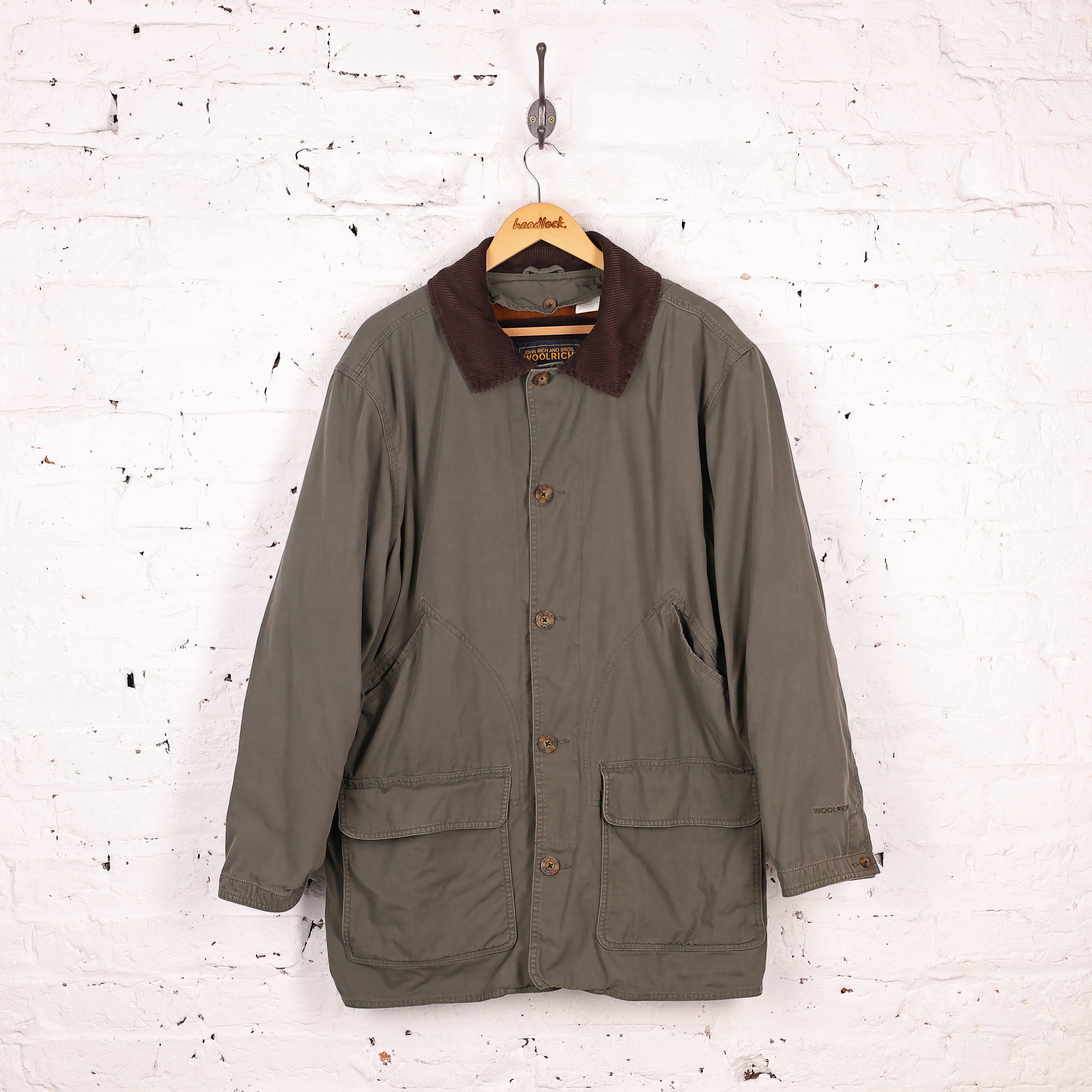 Excellent condition. Woolrich chore jacket in green with cord collar, striped fleece inner lining, double outer pockets and detail buttoning.