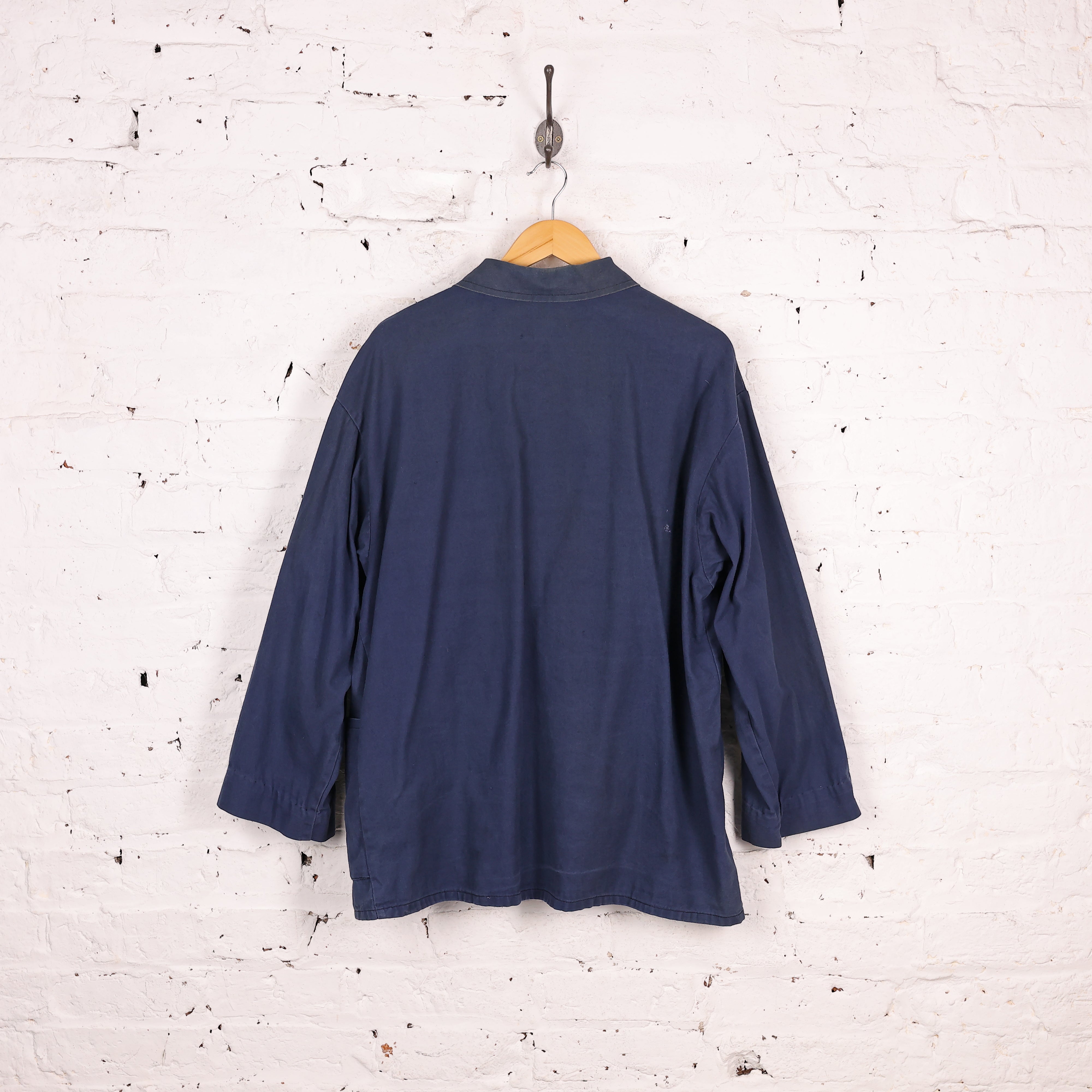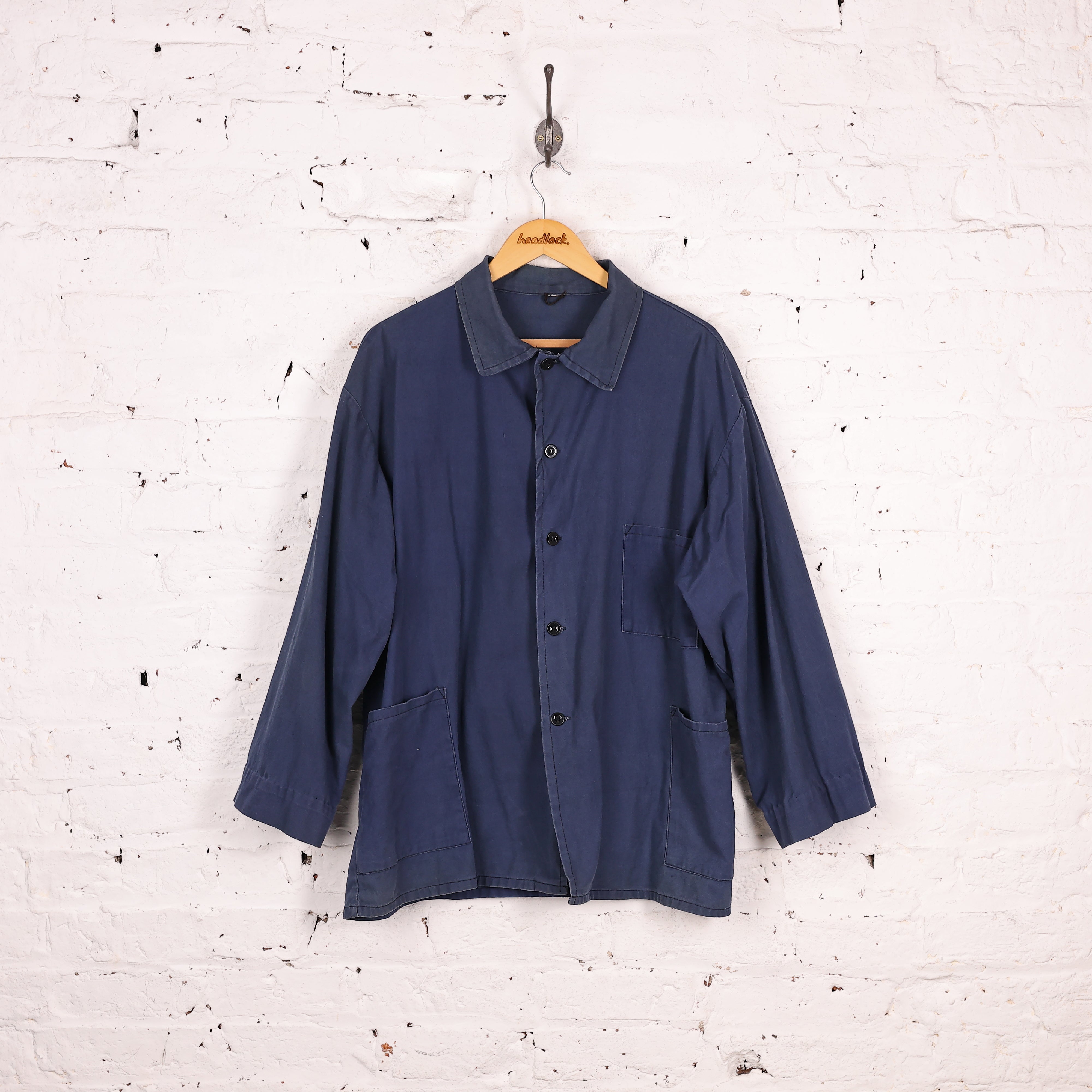 Good condition but some pulls and losses of colour. Work over shirt in blue with black buttoning and three pockets.
