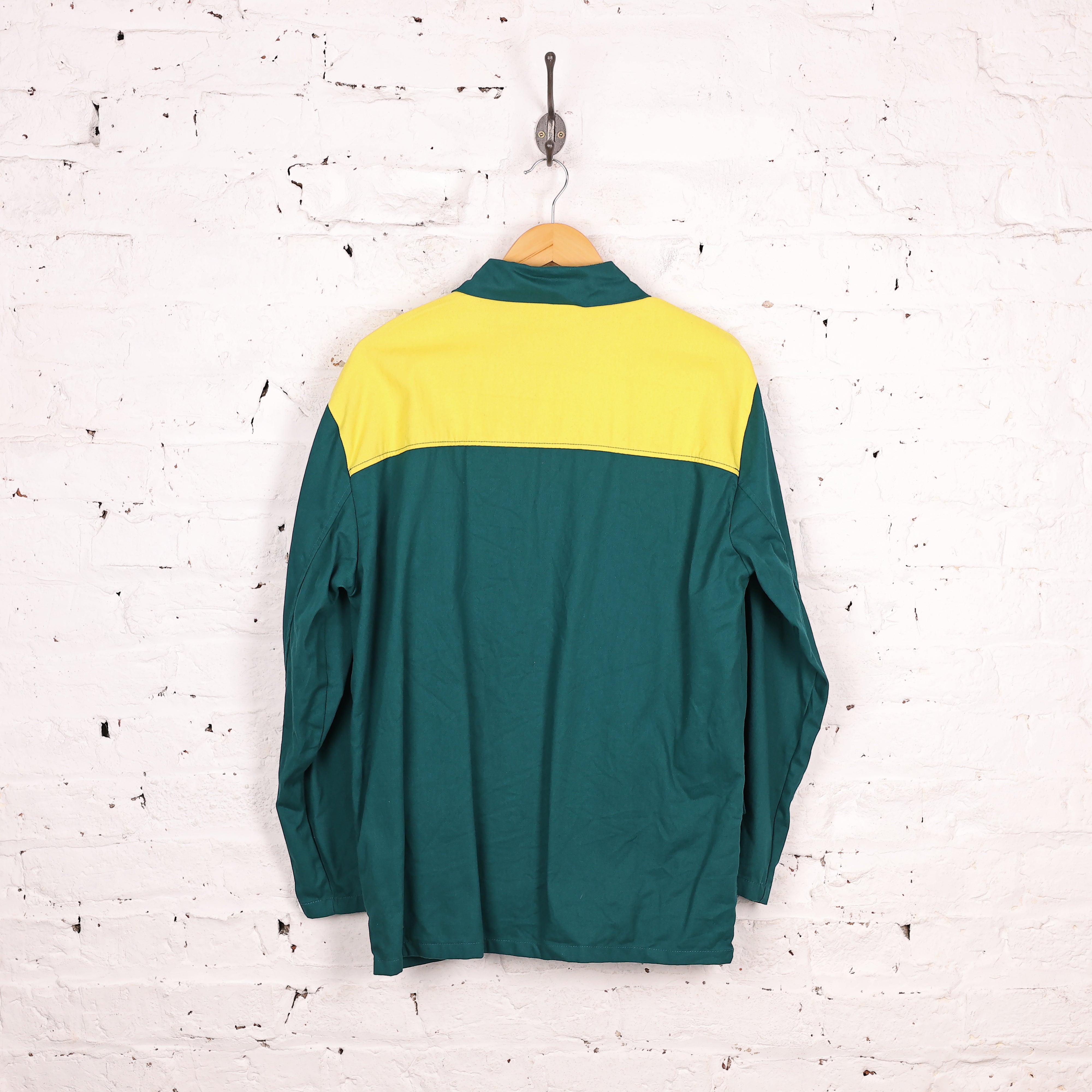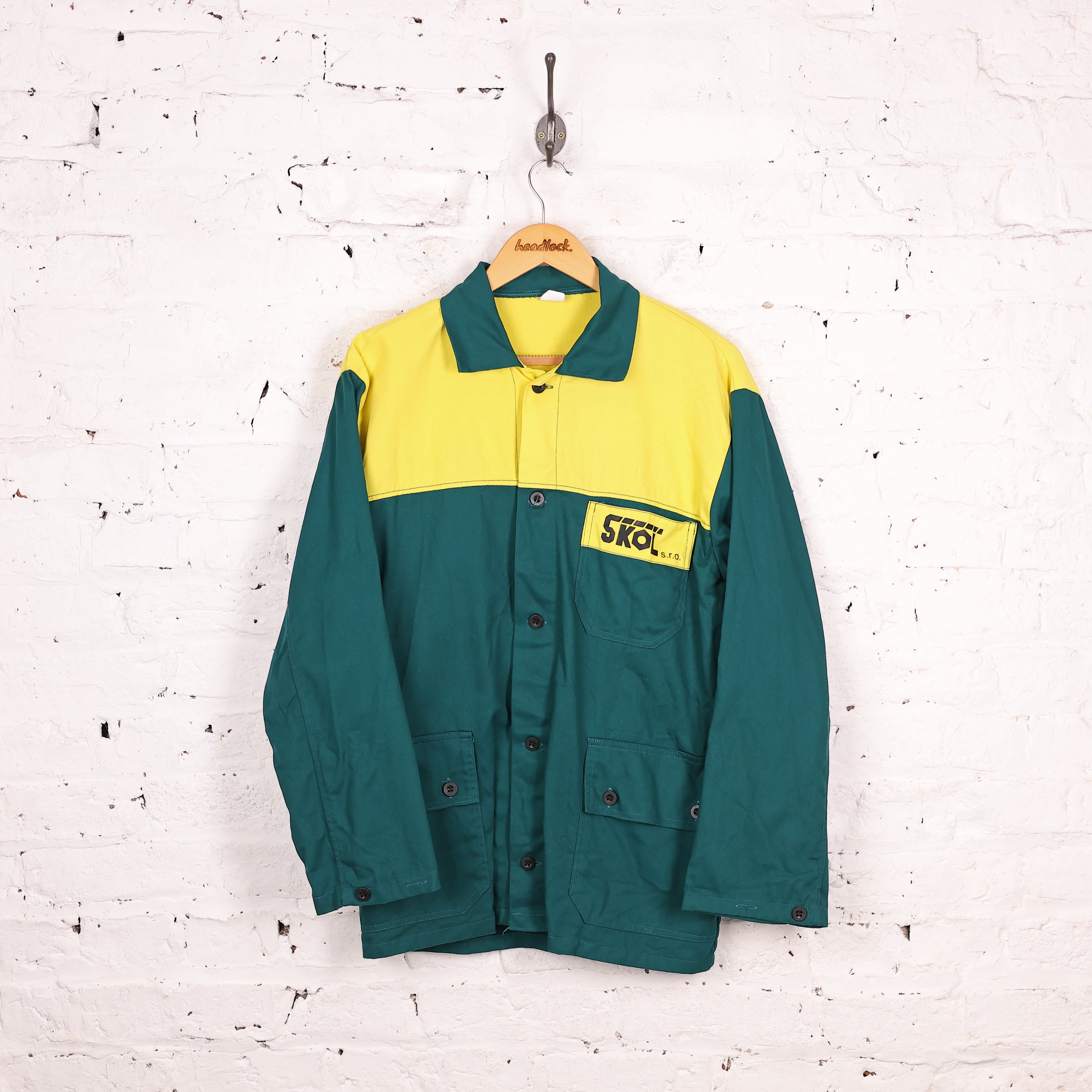 Good condition. Work over shirt in green and yellow colours with black buttoning and three pockets.